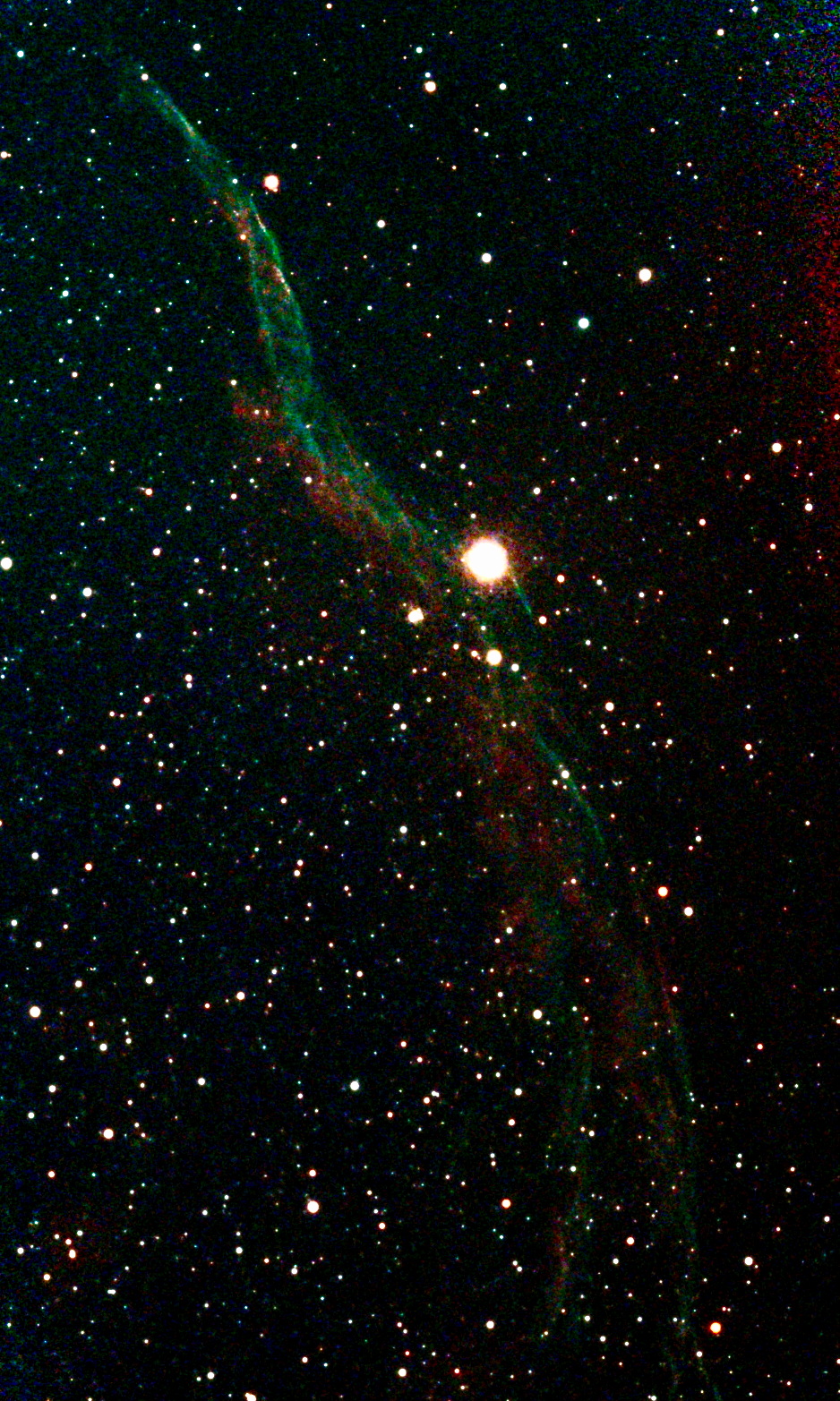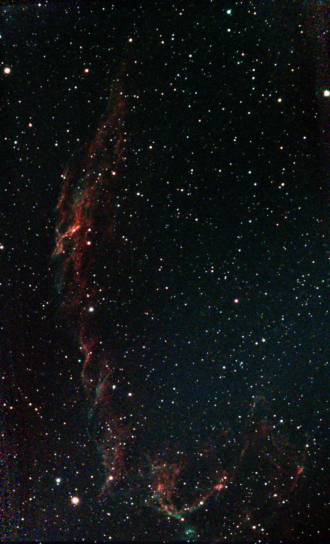 Nach langer Zeit wieder einmal Bilder vom Himmel. Es wird wieder früher dunkel, und endlich ist der Wettergott (nach meinem Urlaub) gnädig. Vorgenommen habe ich mir NGC 6960 und NGC 6992 im Sternbild Schwan. Beides sind Überreste einer Supernova-Explosion die sich in etwa 2500 Lichtjahren vor geschätzt 10000 bis 20000 Jahren ereignet hat. Noch heute driften diese Gaswolken auseinander. Man kann sie in Teleskopen sehen, dann aber ohne Farbe und mit weniger Details. Fotos summieren das Licht über längere Zeit, und können daher mehr zeigen. Die Aufnahmen entstanden am 08. und 09. September. Die Belichtungszeit betrug 50 bzw 60 Minuten.