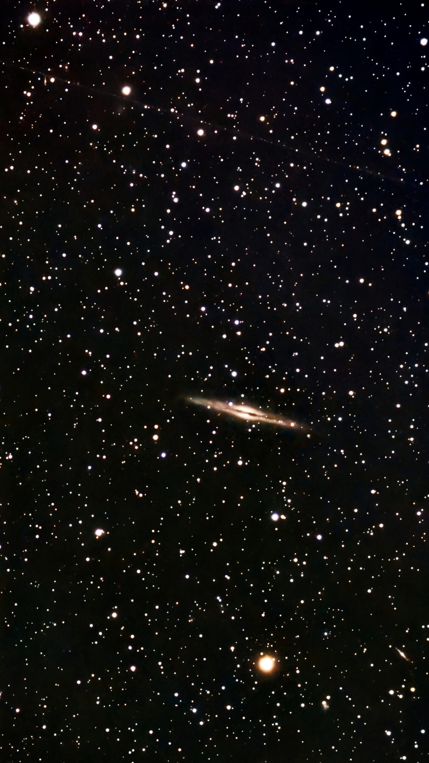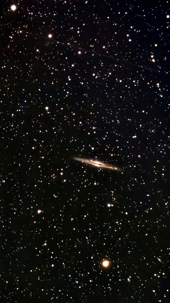 NGC 891 ist eine Spiralgalaxie, sogar eine der größten bekannten. Sie liegt zwar im Sternbild Andromeda und nicht im Sternbild Pegasus, gehört aber zur Galaxiengruppe um NGC 1023, die zwischen den Hauptsternen des Pegasus und Andromeda liegt. Bei NGC 891 sieht man deutlich das „dichte“ Staubband um den Äquator der sich in Kantenlage präsentierenden Galaxie. Dieses Staubband verdeckt die Sterne im Zentrum der Galaxie, sodass sie wie geteilt aussieht. Ich habe sie in meinem 18-Zöller Teleskop auch schon sehr schön visuell gesehen, doch müssen dabei beste Bedingungen vorliegen, und das ist in den letzten Jahren äußerst selten. NGC 891 ist ca. 30 Millionen Lichtjahre entfernt. Belichtungszeit: 16 Minuten.