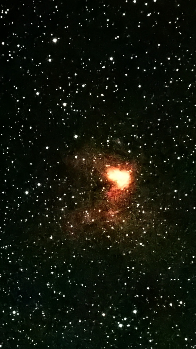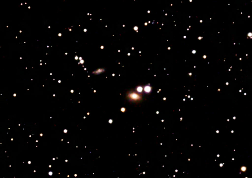 Viel weiter entfernt, etwa 90 Millionen Lichtjahre, befindet sich das Galaxienpaar NGC 1160 / NGC 1161. Das Bild wirkt sehr unscheinbar, doch der Interessierte ist fasziniert von der großen Entfernung. Immerhin wurde das Licht, das im Bild festgehalten wurde, vor 90 Millionen Jahren ausgesendet, also rund 25 Millionen Jahre vor dem Aussterben der Dinosaurier. Die verwaschenen „Flecken“ sind die beiden Galaxien. Belichtungszeit: 18 Minuten.