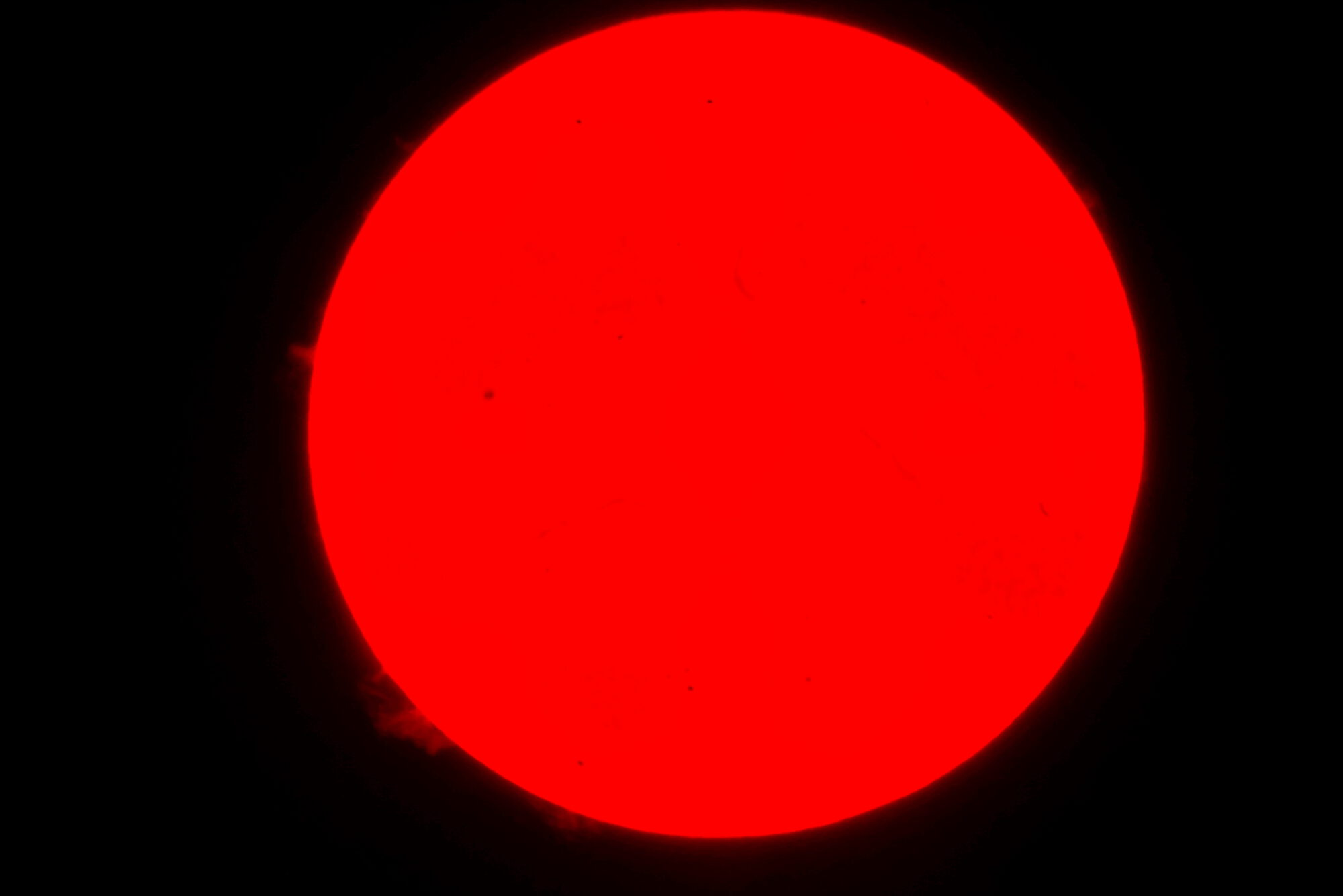 Die Polarlichter sogar in Deutschland sind ja der Beweis für die Sonnenaktivität, die sich zur Zeit im Maximum befindet. Mein Lunt 60 steht auch wieder zur Verfügung, und so konnte ich heute mal Aufnahmen von unserem Zentralgestirn mit der Sony machen. Im H-alpha-Bereich (rote Sonne) sieht man schön die Protuberanzen und einige Flecken, einer davon ziemlich groß. Im Weißlicht kann man die Protuberanzen nicht sehen. Die hier zu sehenden Protuberanzen ragen ca. 86700 km von der Sonnenoberfläche ins All hinein. Das entspricht mehr als dem doppelten Erdumfang und mehr als dem 7fachen Durchmesser der Erde!