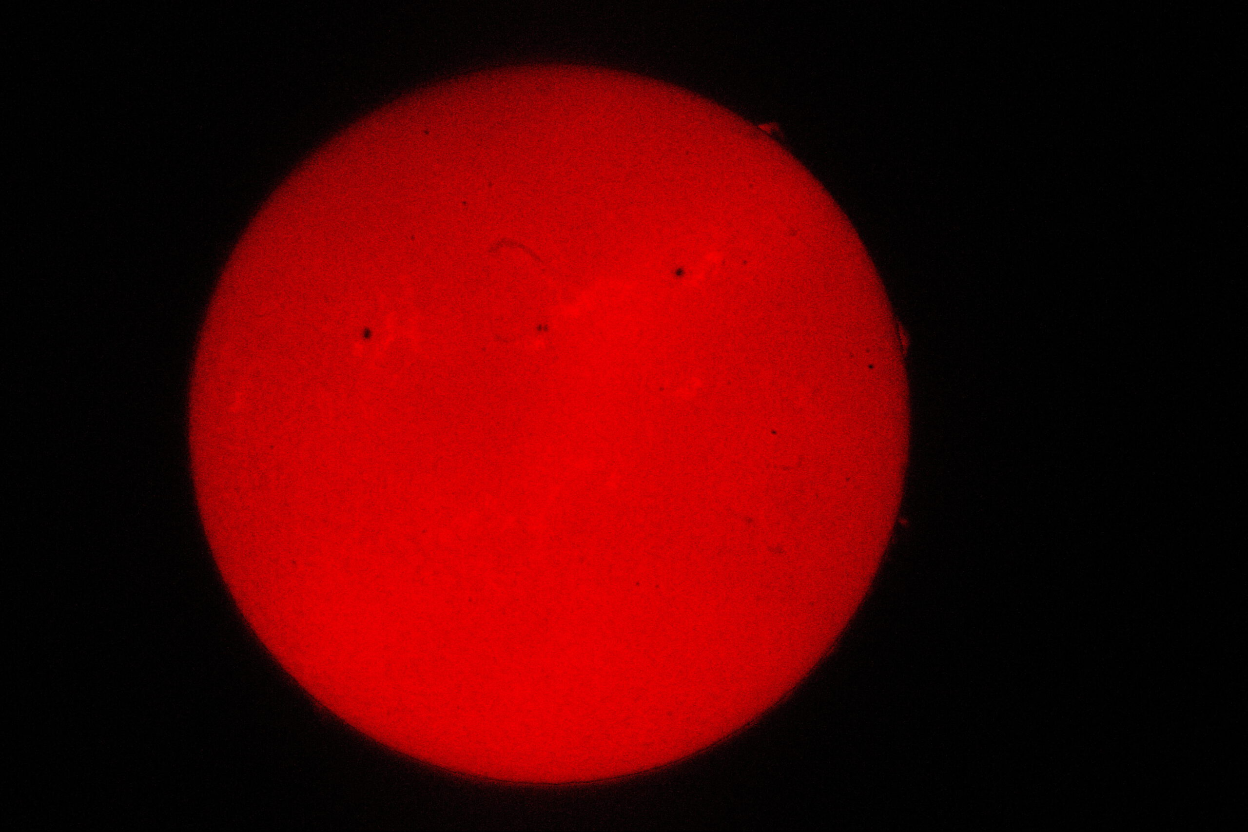 Heute nur ein Sonnenbild. Ein Foto im Weißlicht würde nichts neues ergeben. Im H-alpha-Licht sind aber viele Strukturen zu erkennen. So sieht man einige, wenn auch kleine, Protuberanzen. Auf der uns zugewandten Sonnenoberfläche sieht man einige zum Teil große Flecken. Das sind kühlere Bereiche (bis zu 1500 Grad niedriger als die Umgebung), die durch Magnetfelder hervorgerufen werden. In ihrer Nähe finden oft Eruptionen statt. Die Flecken „wandern“ aufgrund der Rotation der Sonne scheinbar über die Sonnenoberfläche. Eruptionen sieht man als Protuberanzen, wenn sie über den Sonnenrand hinaus ragen. Vor der Sonnenscheibe sieht man sie als dunkle mehr oder weniger fadenartige Gebilde. Auf dem heutigen Bild ist eine solche große Eruption (auch Fackel genannt) gut zu sehen. Sehr große Ausbrüche schleudern Sonnenmasse ins Weltall. Treffen solche auf die Erde, entstehen Polarlichter. Auch auf dem heutigen Bild erkennt man die Granulation mit helleren und dunkleren Bereichen.